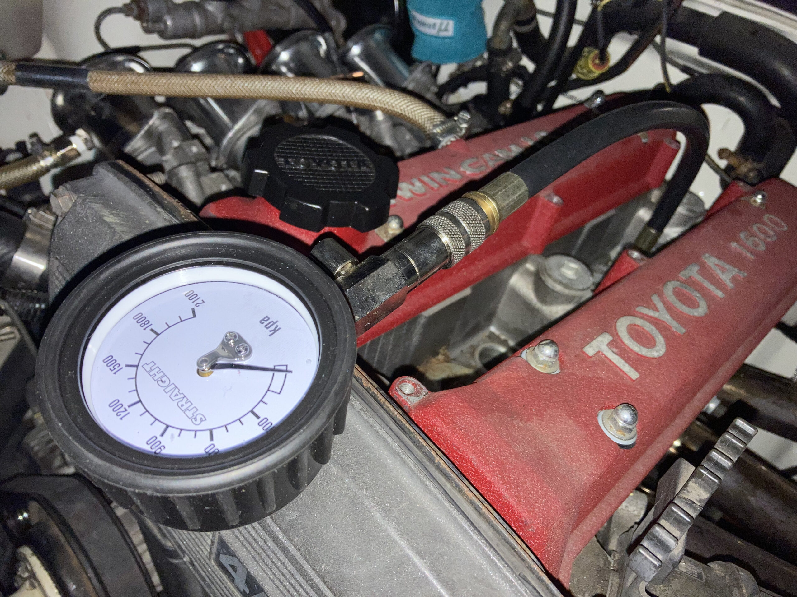 コンプレッションゲージを取り付けて、エンジン始動出来ない状態にし、アクセル全開でクランキングさせます。